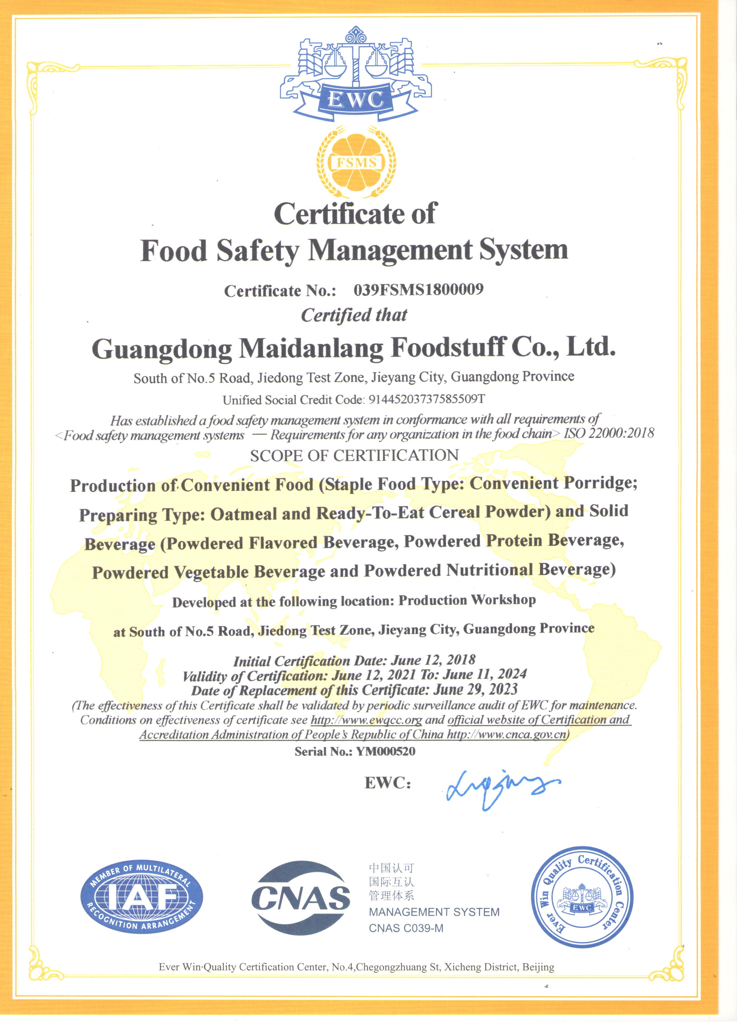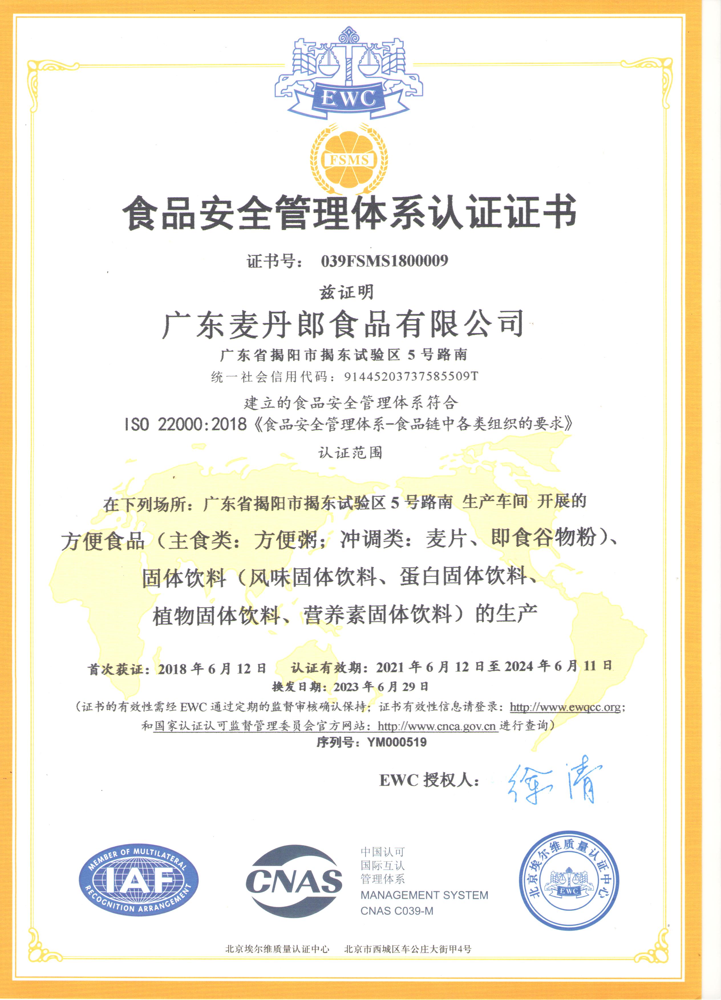 2014年,广东麦丹郎食品有限公司申请并通过HACCP体系认证;2023年再次申请并通过HACCP体系认证,于此同时,我司新增ISO22000食品安全管理体系认证并顺利通过。由于我司一直用最高的质量标准严格管理,因此今年也通过了第三方机构的严苛审核,顺利取得了HACCP、ISO22000体系双认证。